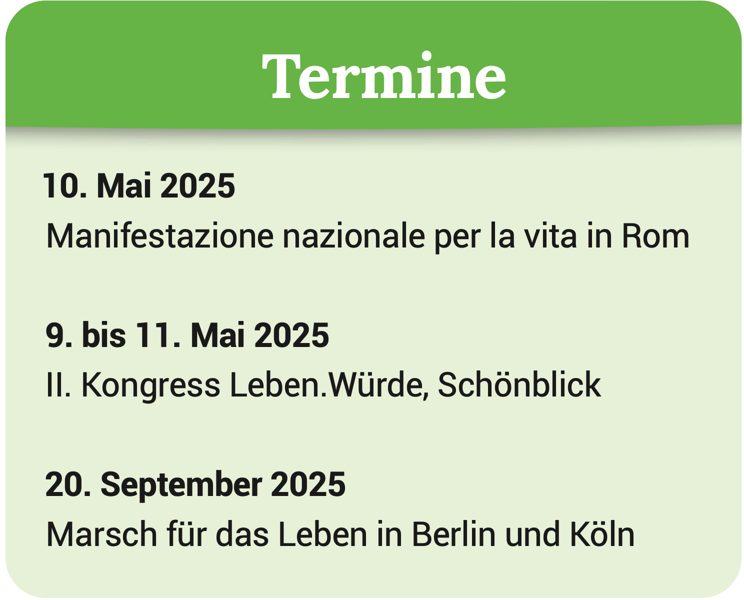 2025 ist erneut ein arbeitsreiches Jahr: Nicht nur, weil wir am 20. September den Marsch für das Leben in Berlin und zeitgleich in Köln veranstalten, nicht nur, weil die Politik uns besonders in Atem hielt, sondern auch, weil vom 09.–11. Mai unser II. Leben.Würde-Kongress auf dem Schönblick stattfindet, mit IDEA als weiterem Veranstaltungspartner und dem TV-Sender EWTN als Medienpartner, der seit Juli 2024 das erste deutschsprachige Bioethik-Nachrichtenmagazin ausstrahlt. Das Programm mit Plenumsvorträgen und Seminaren steht, ein Highlight ist der Festakt der Stiftung Ja zum Leben mit Verleihung ihres Stiftungspreises.
