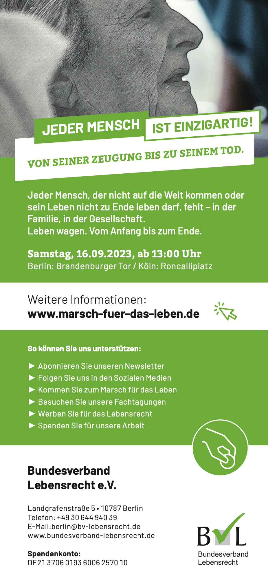 Deshalb erweitern wir erneut unseren Aktionsradius und zeigen im September den Menschen in Köln und in Berlin, dass es kein lebensunwertes Leben gibt gibt und geben kann. Unser Ziel ist es, an einer wirklich humanen Gesellschaft zu bauen, in der inhumane Handlungen wie Abtreibung, begleitete Selbsttötung, Euthanasie, Ausbeutung von Frauen durch so genannte „Leihmutterschaft“ nicht stattfinden – weil sie die Würde des Menschen in ihrem Kern trägt, niemanden alleinlässt und für alle schwierigen Lebenssituationen Unterstützung und Alternativen anbietet.